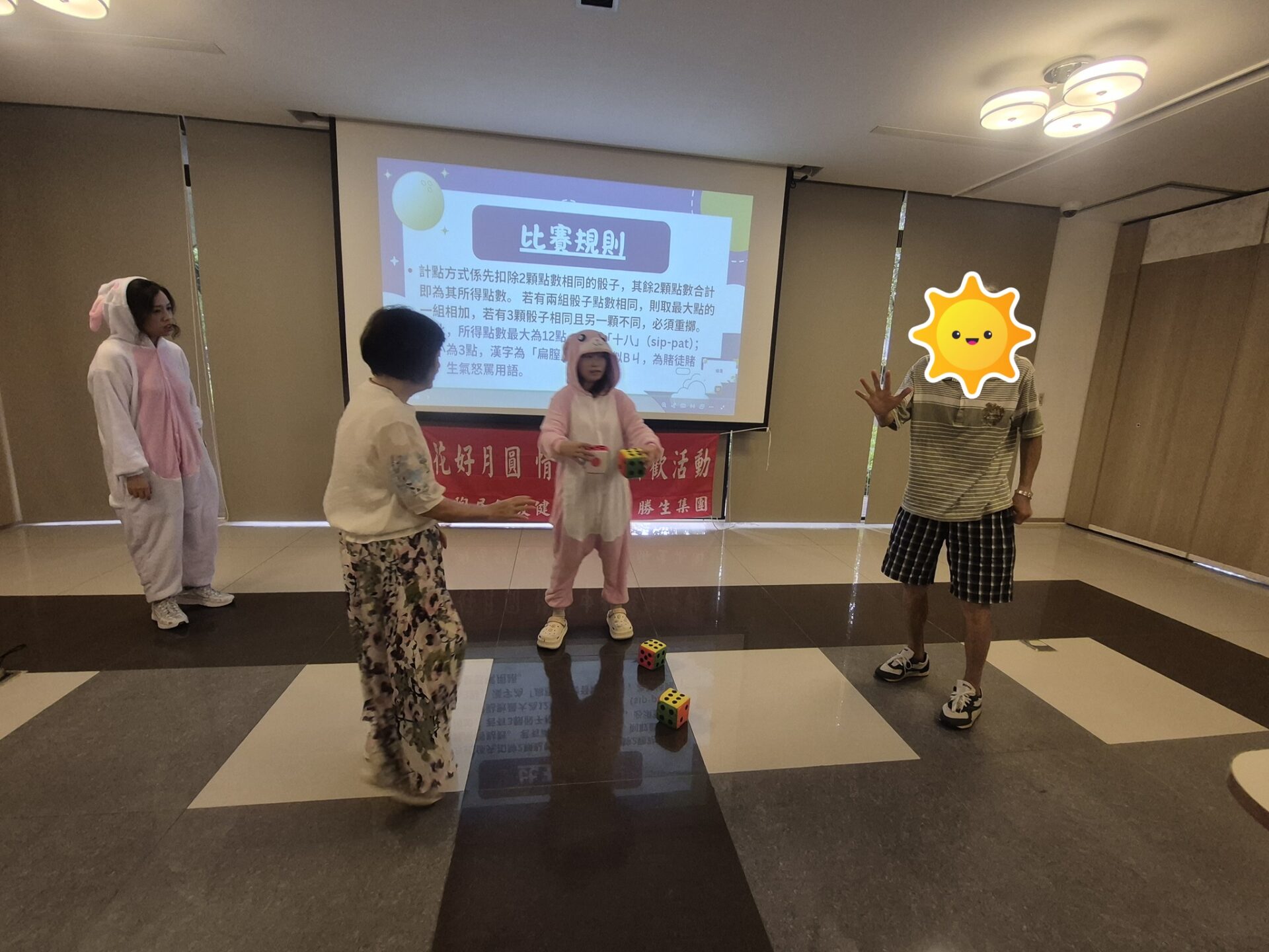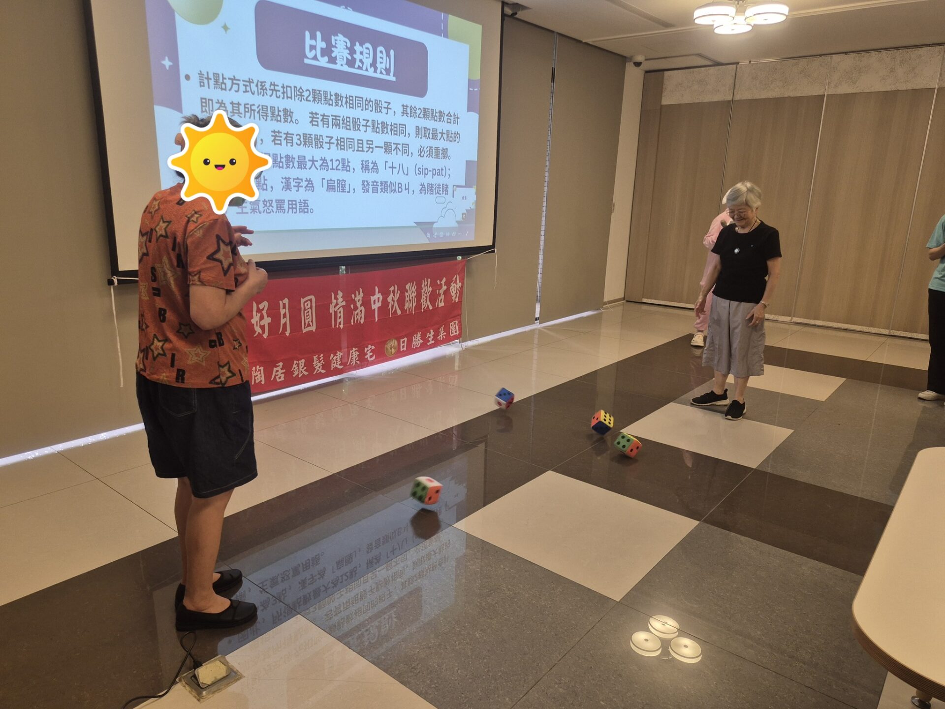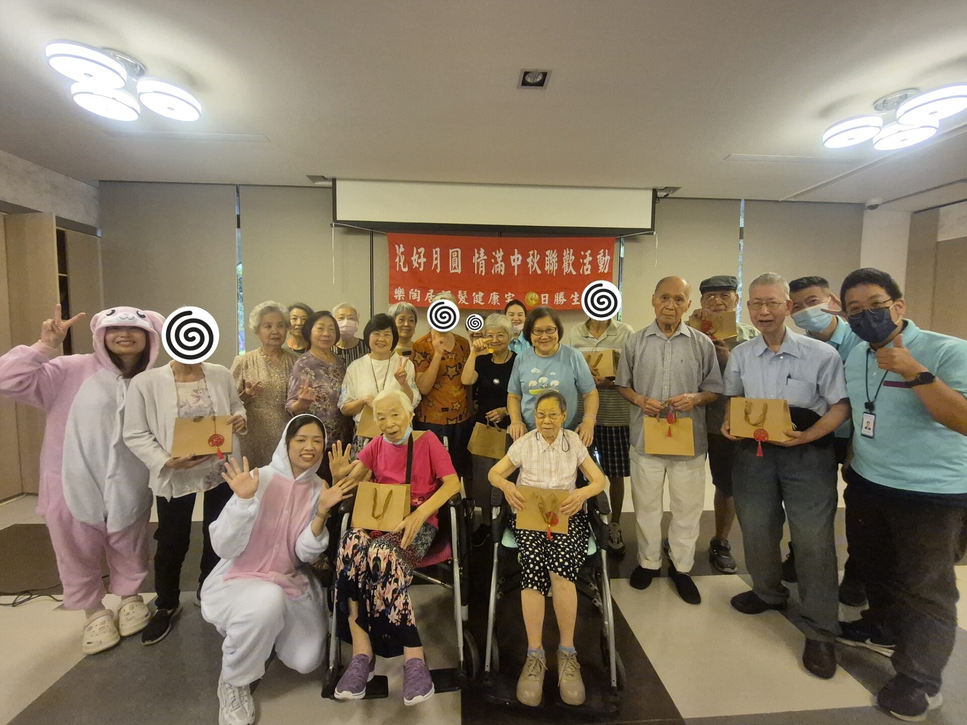月圓人團圓,中秋佳節團聚時刻,本次活動除了7-9月壽星慶生會外,還安排了趣味博餅遊戲,工作人員化身玉兔,與住戶同樂