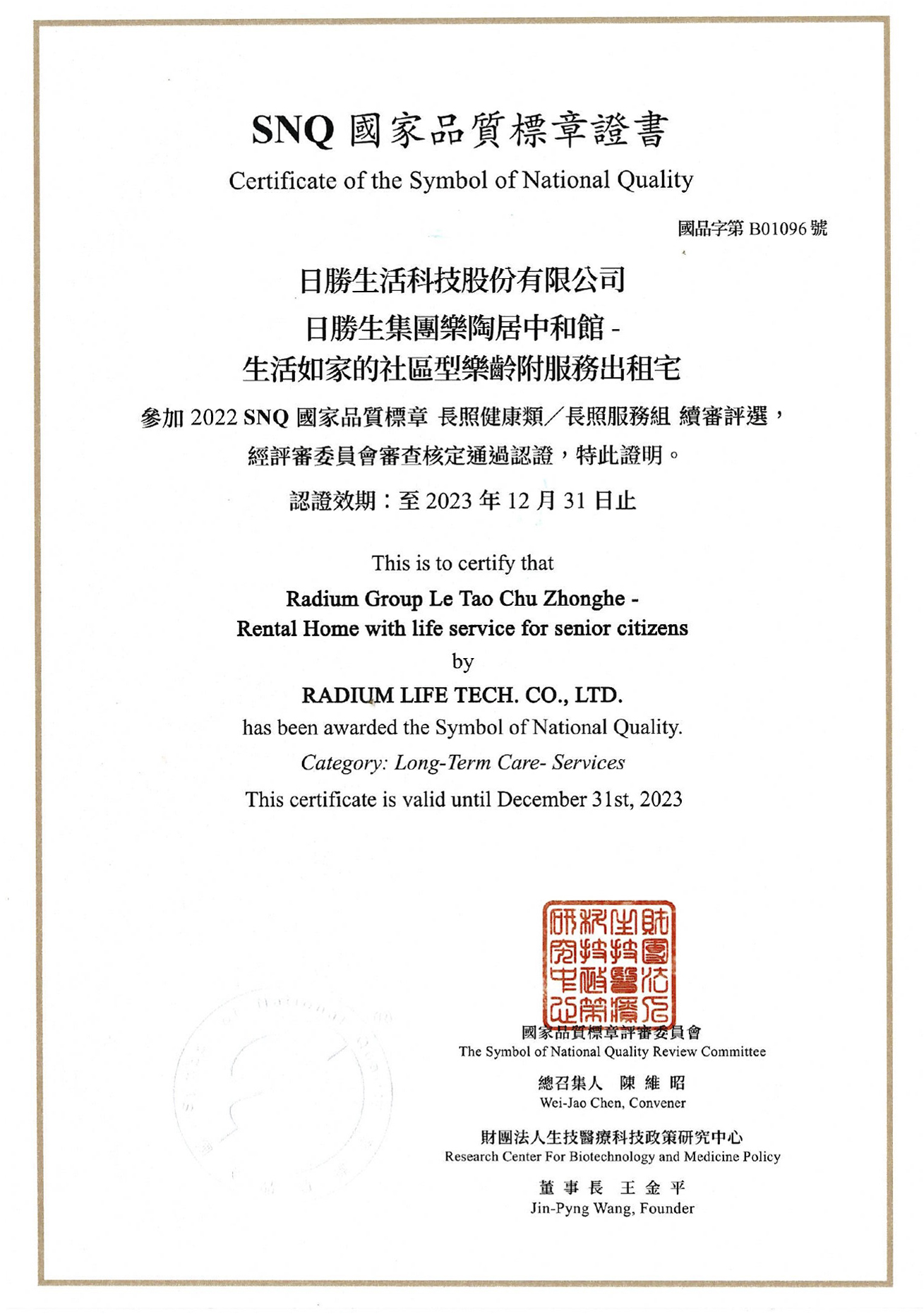 日勝生「樂陶居」藉由專業團隊的健康照顧技能,深信在配合我國健康老化(Health Aging)及預防及延緩的政策、專業人才養成的培育及學習下,必能落實與創「具品質、有服務、具創新」多元且享有健康管理、樂活養身的青銀共居住宅,更於2021年榮獲「SNQ國家品質標章」評選之「長照類/企業服務業評核認證」,亦於2022年起持續參與續審評核,並通過認證。
